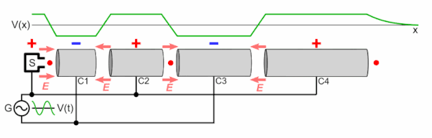 - An electronic oscillator and amplifier (G) which generates a radio frequency AC voltage of high potential (usually thousands of volts) which is applied to the cylindrical electrodes. This is the accelerating voltage which produces the electric field which accelerates the particles. Opposite phase voltage is applied to successive electrodes. A high power accelerator will have a separate amplifier to power each electrode, all synchronized to the same frequency.