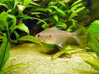 The bleeding heart tetra, Hyphessobrycon erythrostigma, is a peaceful midlevel-dwelling community fish in the aquarium. It grows to 64 mm long and lives about five years. It requires warm water (78°F or 26°C). This fish, like most tetras, needs soft, acid water, pH 6.5-6.8, with plenty of plants. This fish is somewhat susceptible to velvet disease and Ichthyophthirius multifiliis. It is sensitive to water conditions and requires frequent partial water changes.