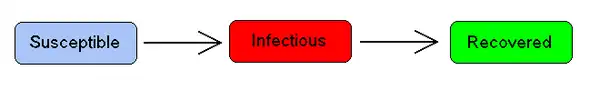 Each member of the population typically progresses from susceptible to infectious to recovered. This can be shown as a flow diagram in which the boxes represent the different compartments and the arrows the transition between compartments, i.e.