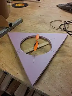 A small-scale prototype of the craft was built to gain insight into the project's scale and construction method. This prototype revealed that the scale of the craft was going to be much larger than initially suspected in order to accomodate the span of the fan propellers. The main craft body was constructed out of 0.75" thick pink insulation foam. It was made from four triangular pieces that formed a 46" equilateral triangle, and was two sheets thick (1.5"). 8.5" holes were cut at the three corners as ducts for three fans, and the top edges of the craft body were beveled to decrease drag on take-off.