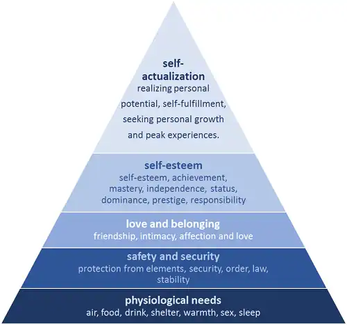 Maslow's hierarchy of needs is often portrayed in the shape of a pyramid, with the largest and most fundamental levels of needs at the bottom, and the need for self-actualisation at the top.