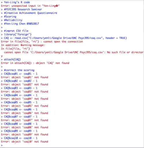 The r code could not be ran because you do not have a data frame uploaded with the existing objects being called upon. Make sure to upload the data set before running this code. Next, make sure that the items are named the same as the ones we are using.When you have two or more data sets open in R Script that share the same objects then R Script gets confused. It does not know which object and which data frame to choose from so instead it masks all the objects. You can close out everything in the R console and then open up just one data set then attach(datanamehere) or inside of function like ggplot2( data = datanamehere, ...).