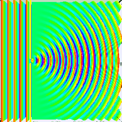 To understand why, put yourself reference frame of your flat sheet. The sheet is now at rest and an electron is moving towards it. By the de Broglie hypothesis, this electron will have wavelength (given by Eq. (3) to be h/mv). But if the electron acts as a wave, it will undergo single slit diffraction as shown in the figures to the left and right. Notice how decreasing the diameter of the hole increases the motion the spreading of the wave. The more you know about the position, the less you know about the motion, and vice versa. With a bit of basic algebra, the well-known equation for single slit diffraction can be shown to be consistent with the following inequality: