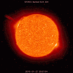 In the images at right, a CME, or "arcs rise above an active region on the surface of the Sun in this series of images taken by the STEREO (Behind) spacecraft on January 27, 2010. The arcs are plasma, superheated matter made up of moving charged particles (electrons and ions). Just as iron filings arc from one end of a magnet to another, the plasma is sliding in an arc along magnetic field lines. In a movie of STEREO observations made between January 26 and January 29, the dynamic streams were initially just over the Sun’s edge and readily spotted as the Sun rotated them more into view."[10]