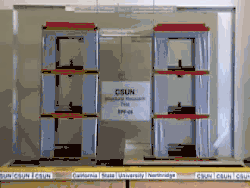 Shake-table testing of two building models at CSUN. The right one is equipped with a base isolation device [3].