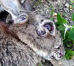 In June 1952, the owner of an estate at Maillebois in north western France inoculated two wild rabbits with myxoma virus in an attempt to control rabbits on his property. The virus (Brazil/Campinas 1949) was obtained from the Virus Culture Collection in Lausanne, Switzerland and has since been known as the Lausanne strain. Unlike the SLS strain introduced to Australia, the Lausanne strain caused the formation of large purple skin nodules. The virus successfully established and gradually spread into the wild rabbit populations of Western Europe, Ireland and the United Kingdom.[22] Some dissemination was clearly deliberate, such as the introduction into Britain in 1953 and the introduction into Ireland in 1954.[23] Unlike in Australia, however, strenuous efforts were made to stop the spread in Europe. These efforts were in vain. It was estimated that the wild rabbit population in the United Kingdom fell by 99% and in France by 90% to 95%. As well as decreasing the wild rabbit population, myxomatosis had significant impacts on the large rabbit farming industry, which produced domestic rabbits for meat and fur.[24] As happened in Australia, the virus has generally become less virulent and the wild rabbit populations more resistant since then.[22]