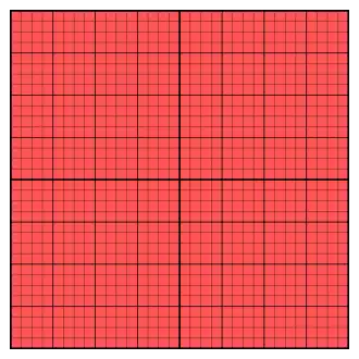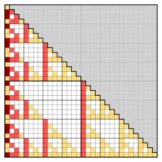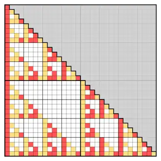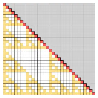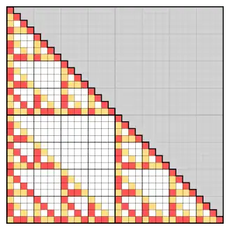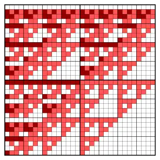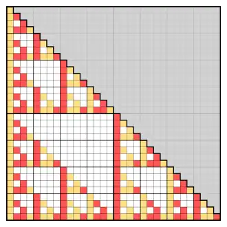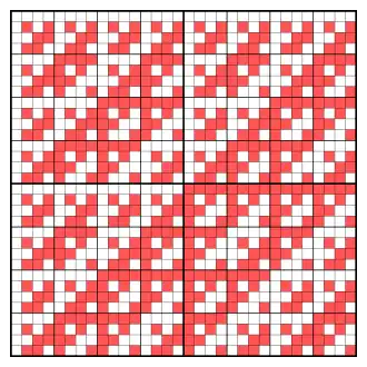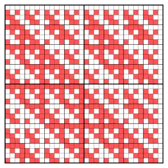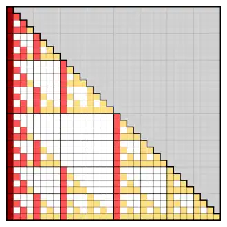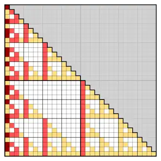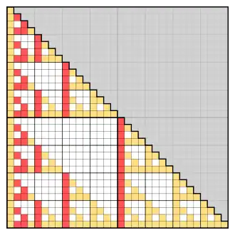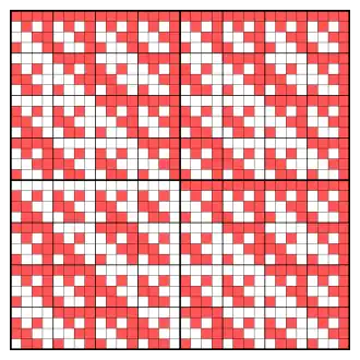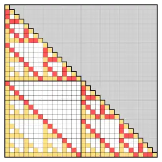 Faction matrix of farofe in red. Green rows are twins of red rows. The resulting matrix also describes a faction. The twin relationship is not just one between Boolean functions, but between factions.