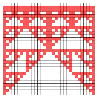 Here the red patterns are meant as Boolean functions, while the green patterns are meant as their Zhegalkin indices.