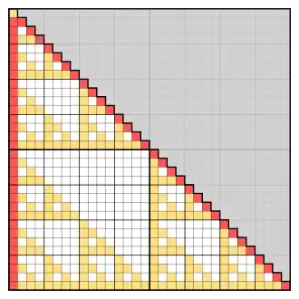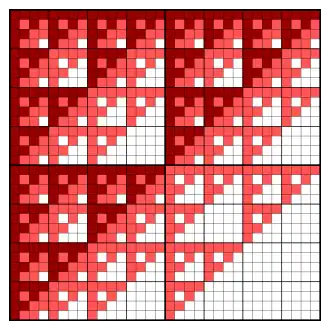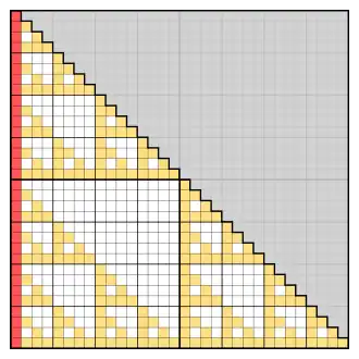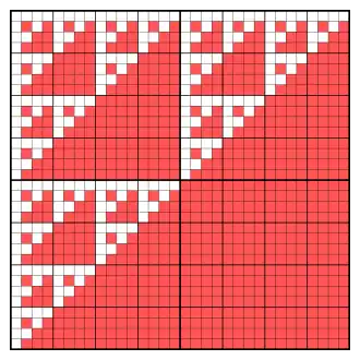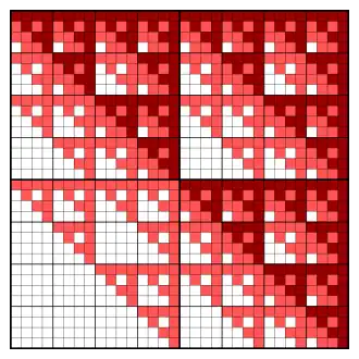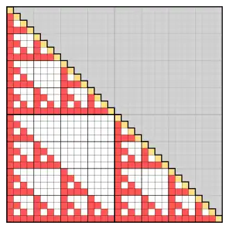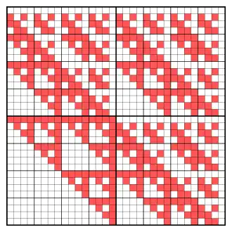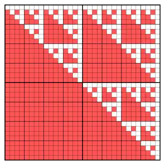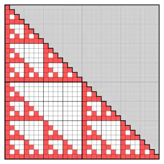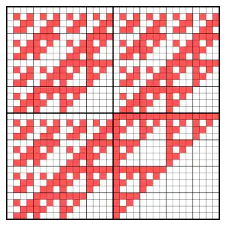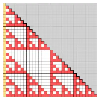 The right side of each pair is a lower triangular matrix. Its entries are part of the Sierpinski triangle, which is the twin of not OR.