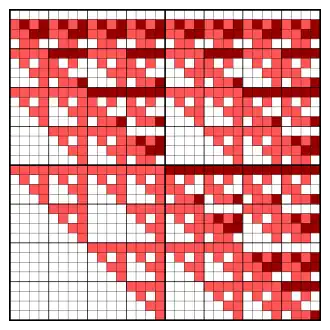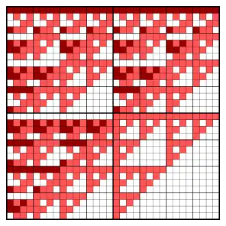 The left side of each pair shows the truth tables of variadic logical connectives. (Compare these 16×16 matrices, which also show the arguments.)