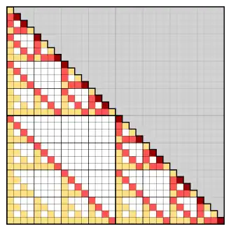 Family matrix of farofe in red. Green rows are twins of red rows, and blue columns are twins of green columns.